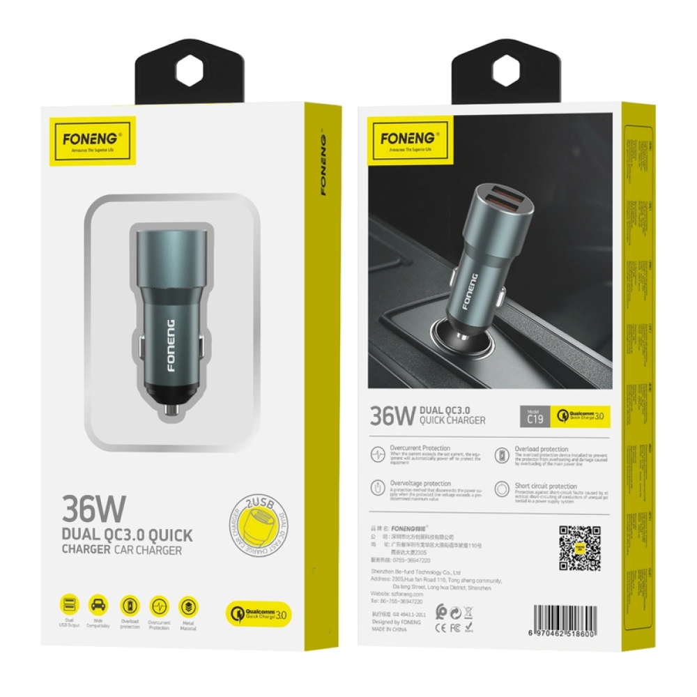 Prodotto CompatibileCaricabatterie da auto 2 porte USB ricarica rapida 36W FONENG C19.